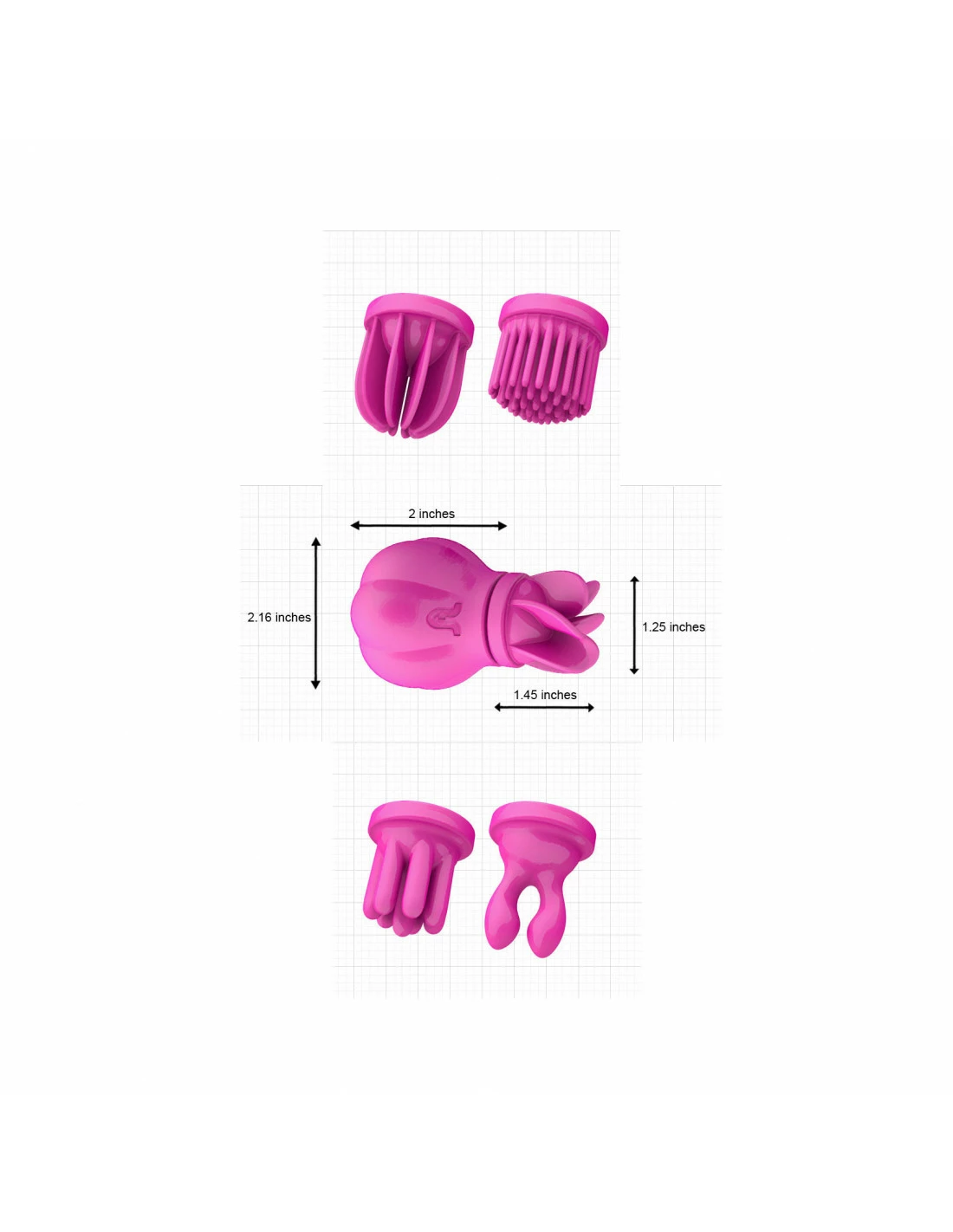 Caress est fourni avec cinq têtes interchangeables auxformes différentes pour de multiples possibilités. Son design en fait un sextoyergonomique avec une bonne prise en main sans risque d’échappement pendant lemassage.