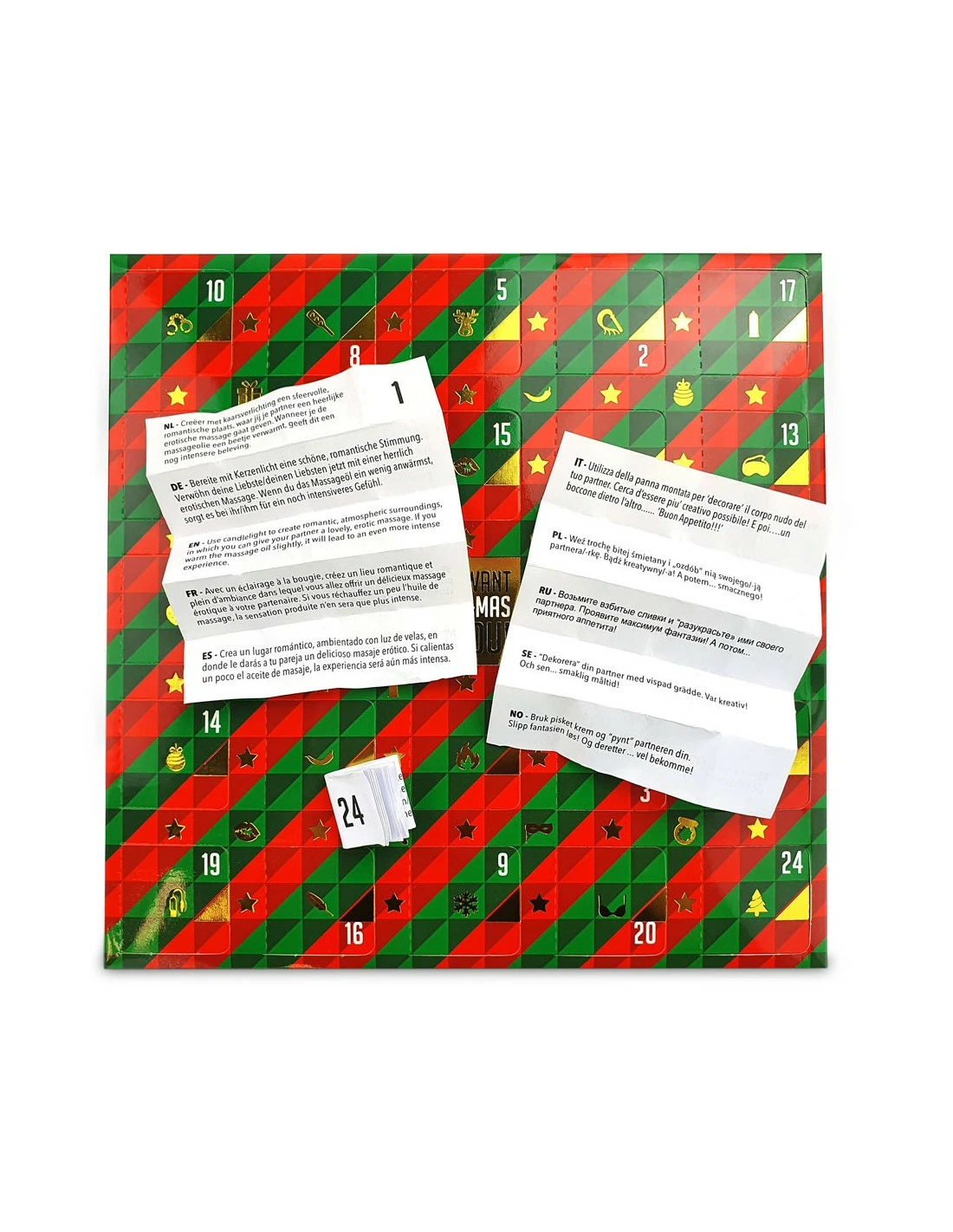 24 occasions de dĂ©couvrir un peu plus votre moitiĂ©, et tout ça sans aucun effort d’imagination, puisque tout est expliquĂ©. De plus, les accessoires qui sont parfois utilisĂ©s pour les dĂ©fis se trouvent sans difficultĂ© chez vous. Vous n’aurez plus hâte que NoĂ«l arrive, car vous vivrez les meilleurs moments avec votre partenaire dans les 24 jours qui le prĂ©cèdent.