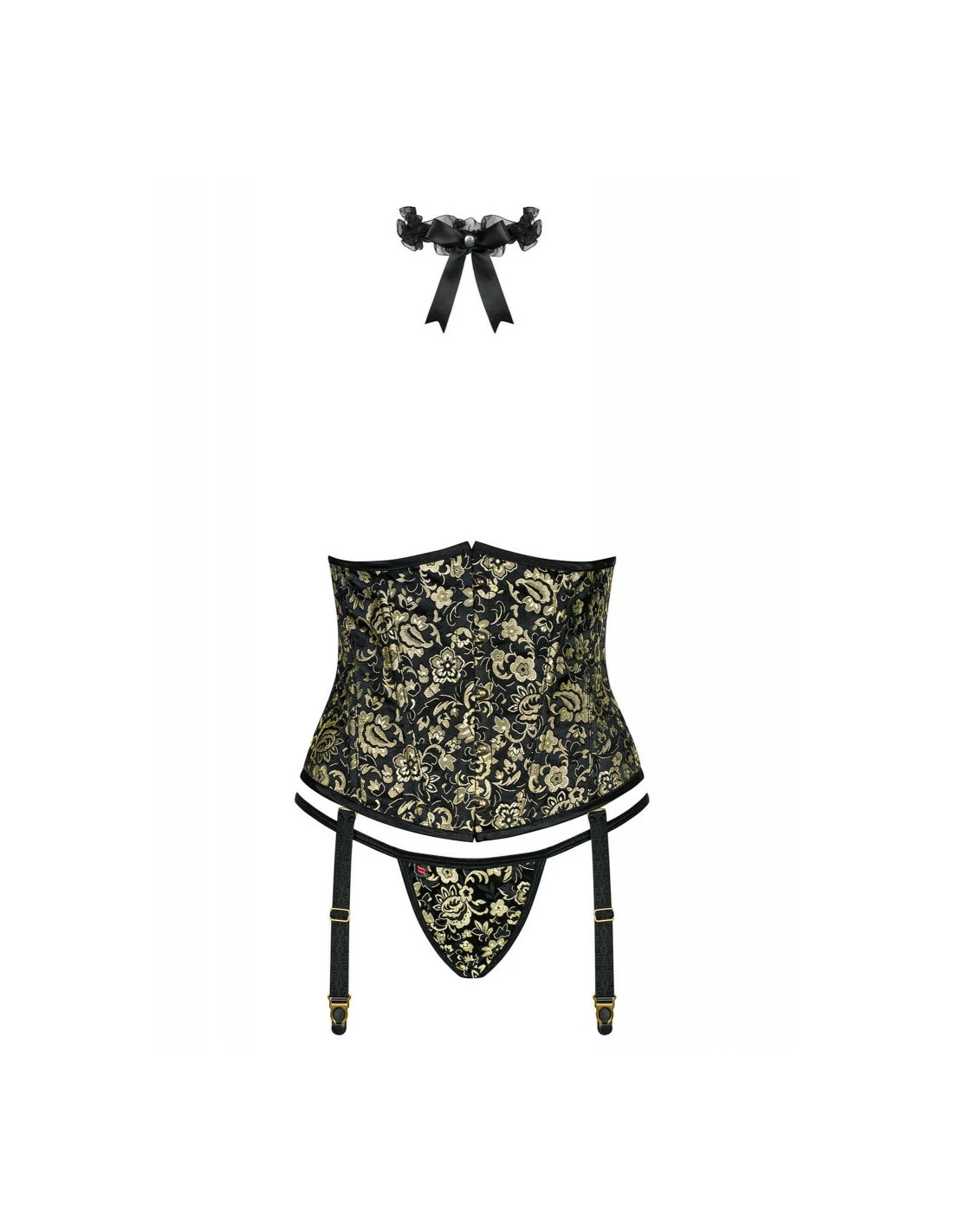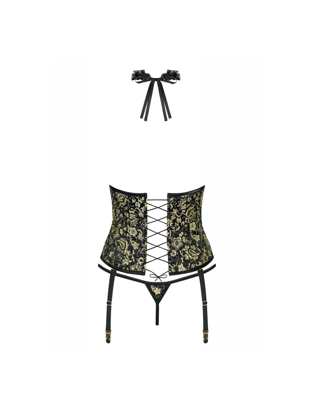 Vous êtes la reine de la soirée avec cette sublime guêpière aux motifs or sur fond noir. Avec sa fermeture à crochet à l’avant et son ravissant laçage à l’arrière, son ajustement est parfait. Pour la touche de charme fatal, portez le tour de cou satin et dentelle assorti.