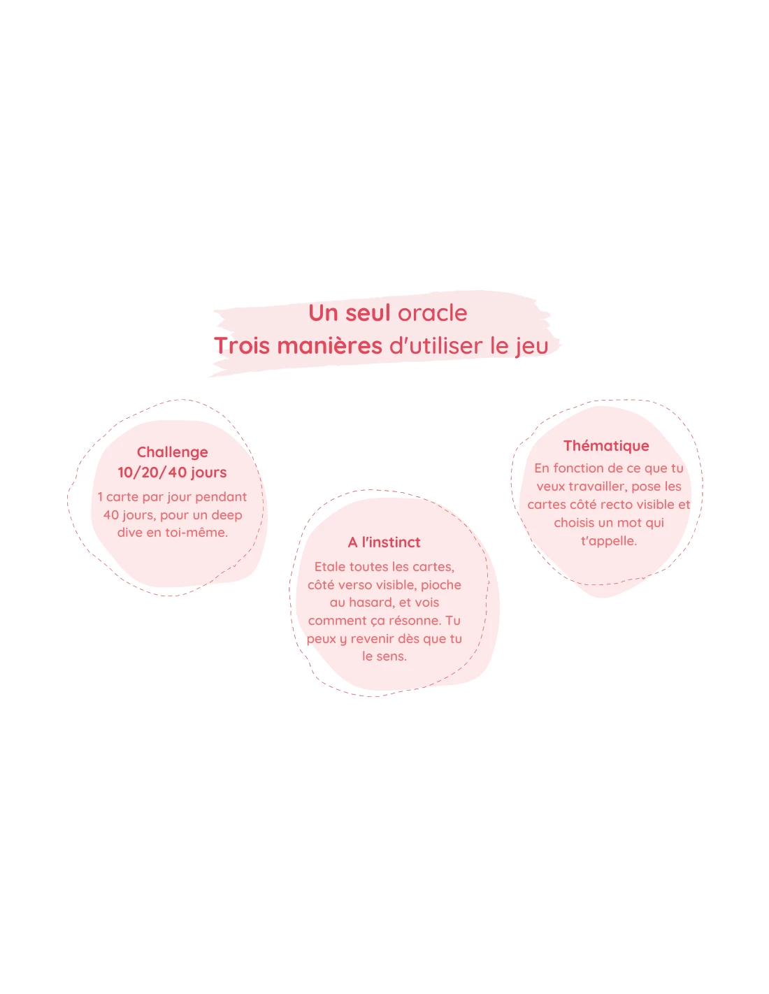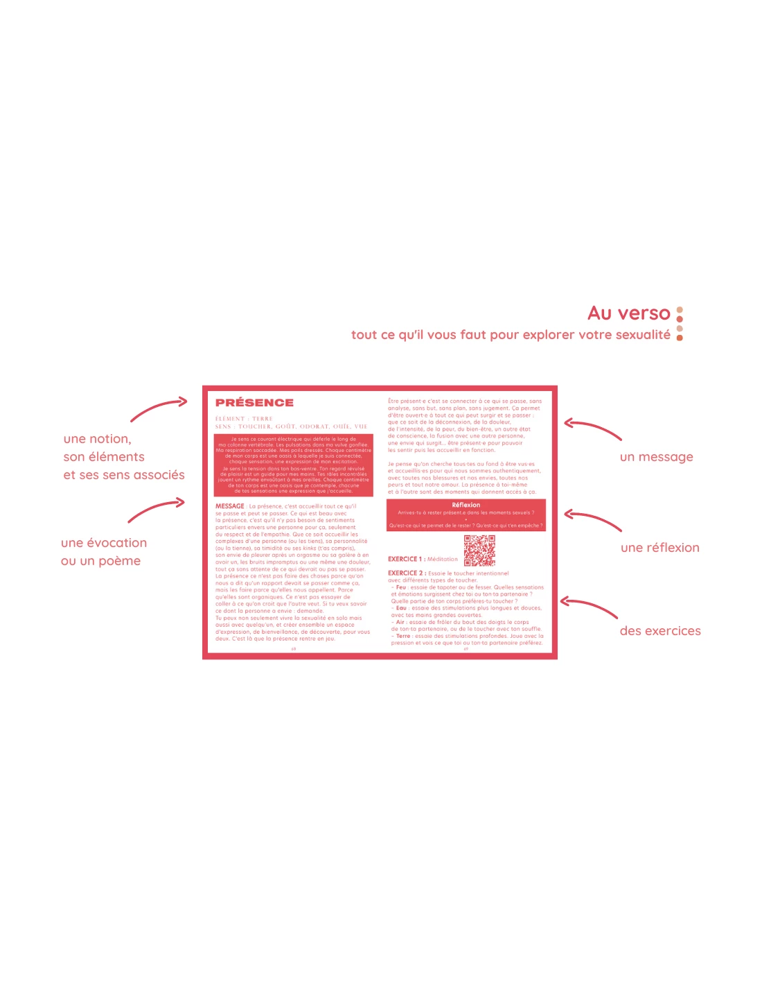 « Notre mission à travers cet oracle : rendre plus accessible ta relation à ta sexualité, à l’exaltation de tes sens et à l’expression de ta sensualité. Nous sommes convaincues qu’il s’agit d’une porte d’entrée vers une vie aussi orgasmique qu’authentique. Inspirées de nos propres cheminements, chaque carte propose un travail sur soi ludique, interactif et riche de sens.