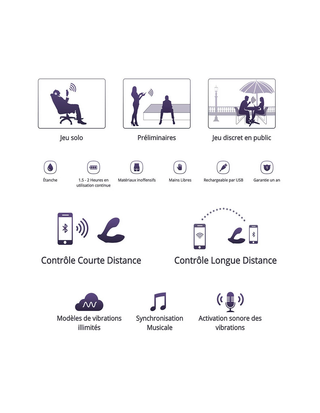 Plus besoin de vos mains mis à part pour vous servir de l’application Lovense Wearables. Le bluetooth permet de contrôler votre plaisir jusqu’à 6 mètres de distance par votre partenaire ou bien vous-même pour des jeux lors de sorties publiques. Sinon vous pouvez utiliser internet (comme pour tous les jouets Lovense) pour un contrôle à distance de plusieurs kilomètres.