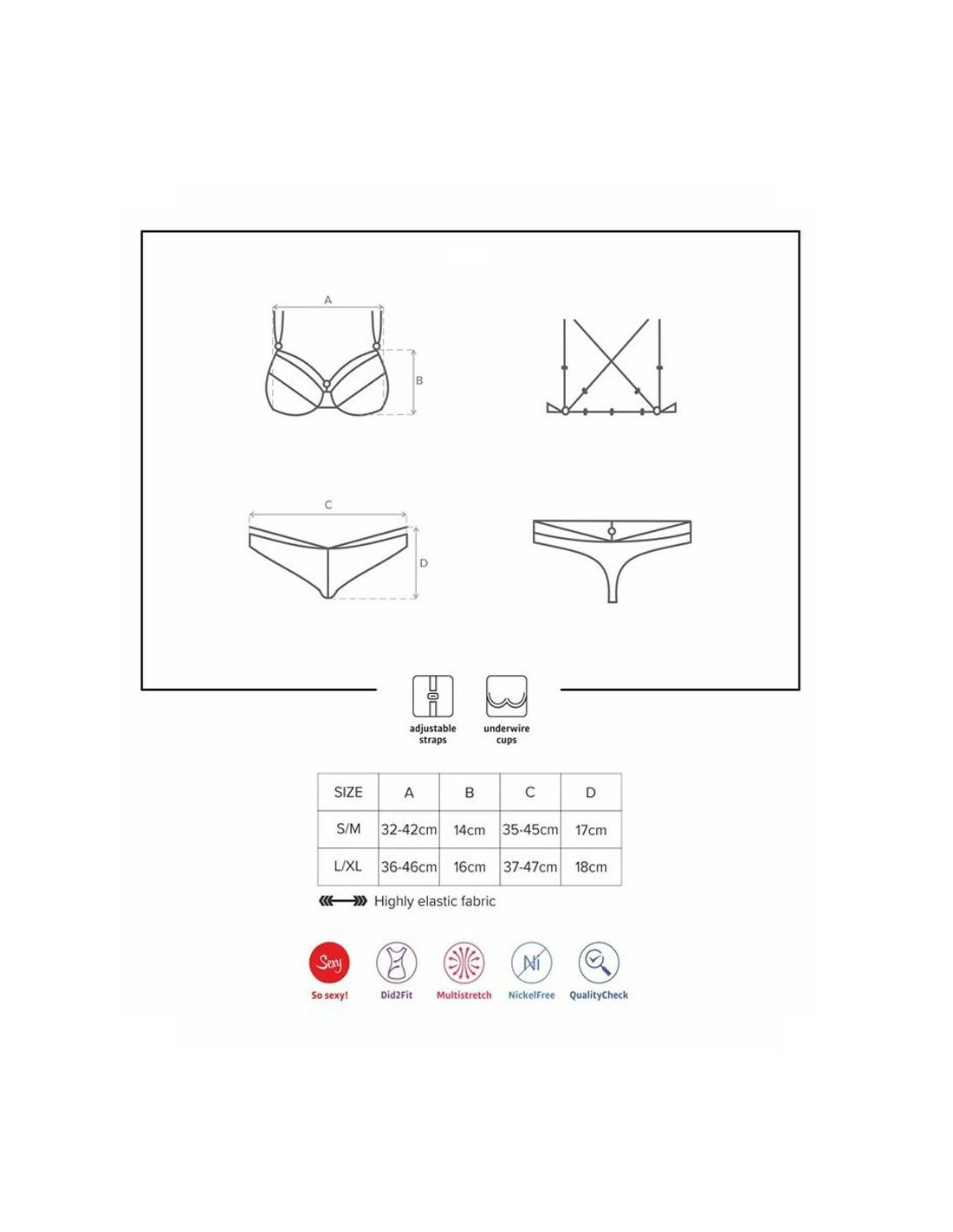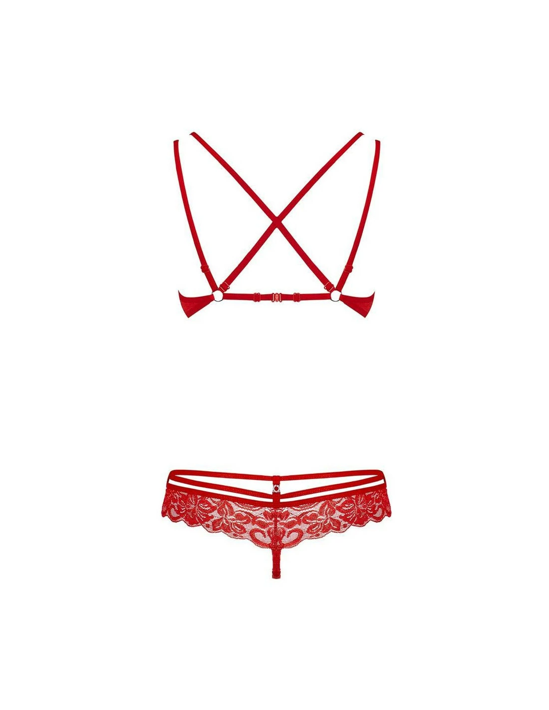Cet ensemble est indéniablement très beau. Un style à la fois sexy, romantique et moderne qui fera surement craquer votre moitié. Le soutien-gorge en dentelle florale sublime votre poitrine grâce à sa forme pigeonnante. Les fines lanières sur le haut desseins, qui s’entrecroisent dans le dos accentuent les courbes. Ne craignez rien :elles sont 100% réglables pour que vous puissiez les ajuster parfaitement.
