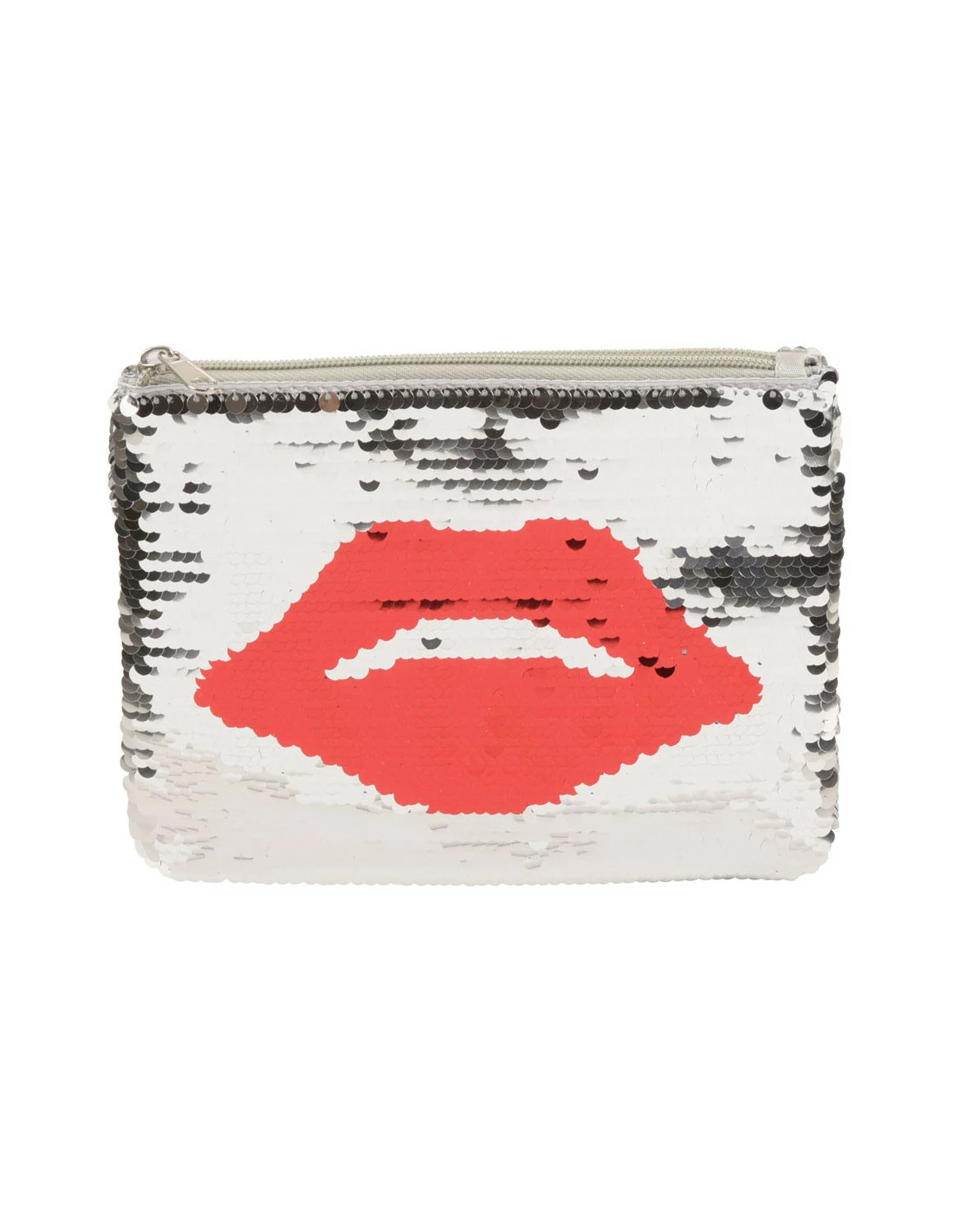 Vous retrouverez sur une face de la trousse une bouche rouge des plus sexy et tendance avec un fond de couleur argentée tout en sequins.