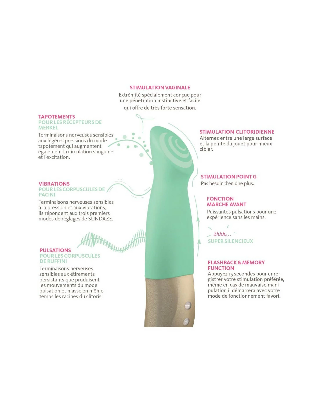 - à vitesse élevée, le Sundaze va tellement vite qu’il dispense des vibrations. Placez-le alors sur le gland du clitoris, ou au niveau du point G, pour des sensations fortes