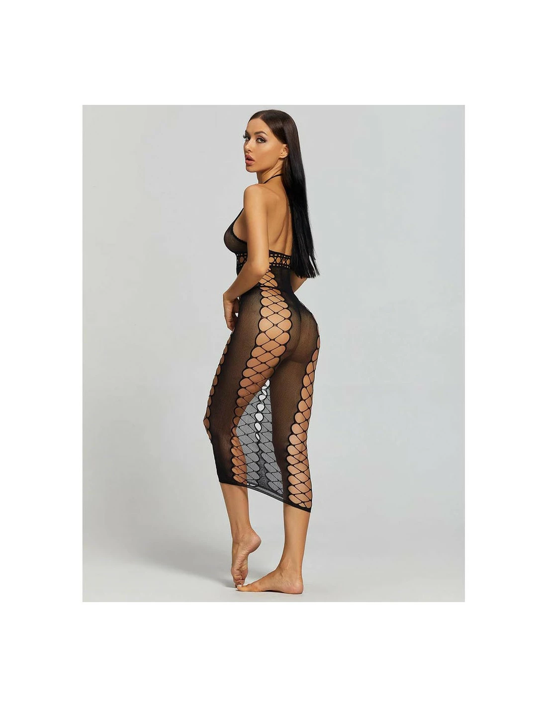 Une robe ultra sexy, très longue mais aussi très ajourée et transparente. Large résille sur les cuisses, frise de cercles sous le buste, et un voile plus opaque pour laisser deviner les zones plus intimes.