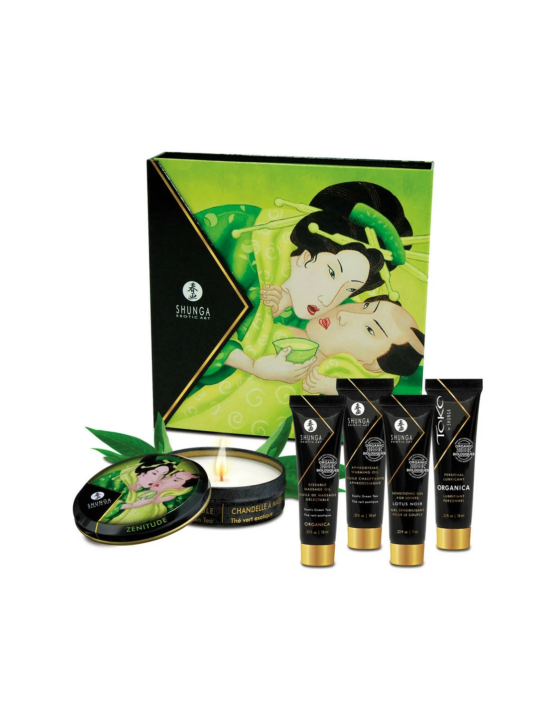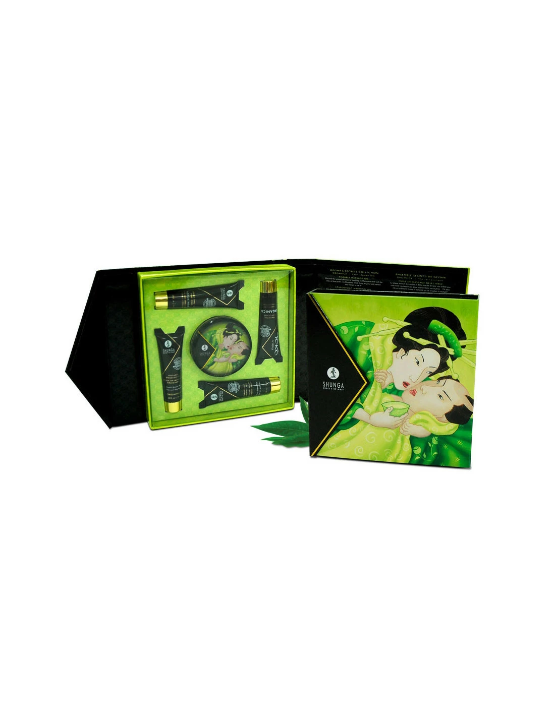 Ce Coffret de Massage Secrets de Gaisha au thé vert exotique est un petit format pratique à transporter avec une belle illustration japonaise.
