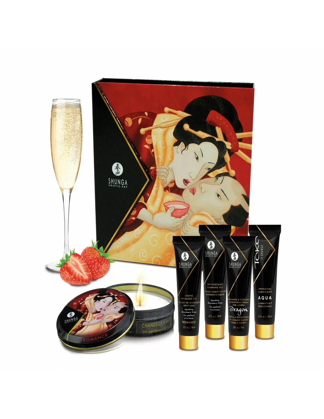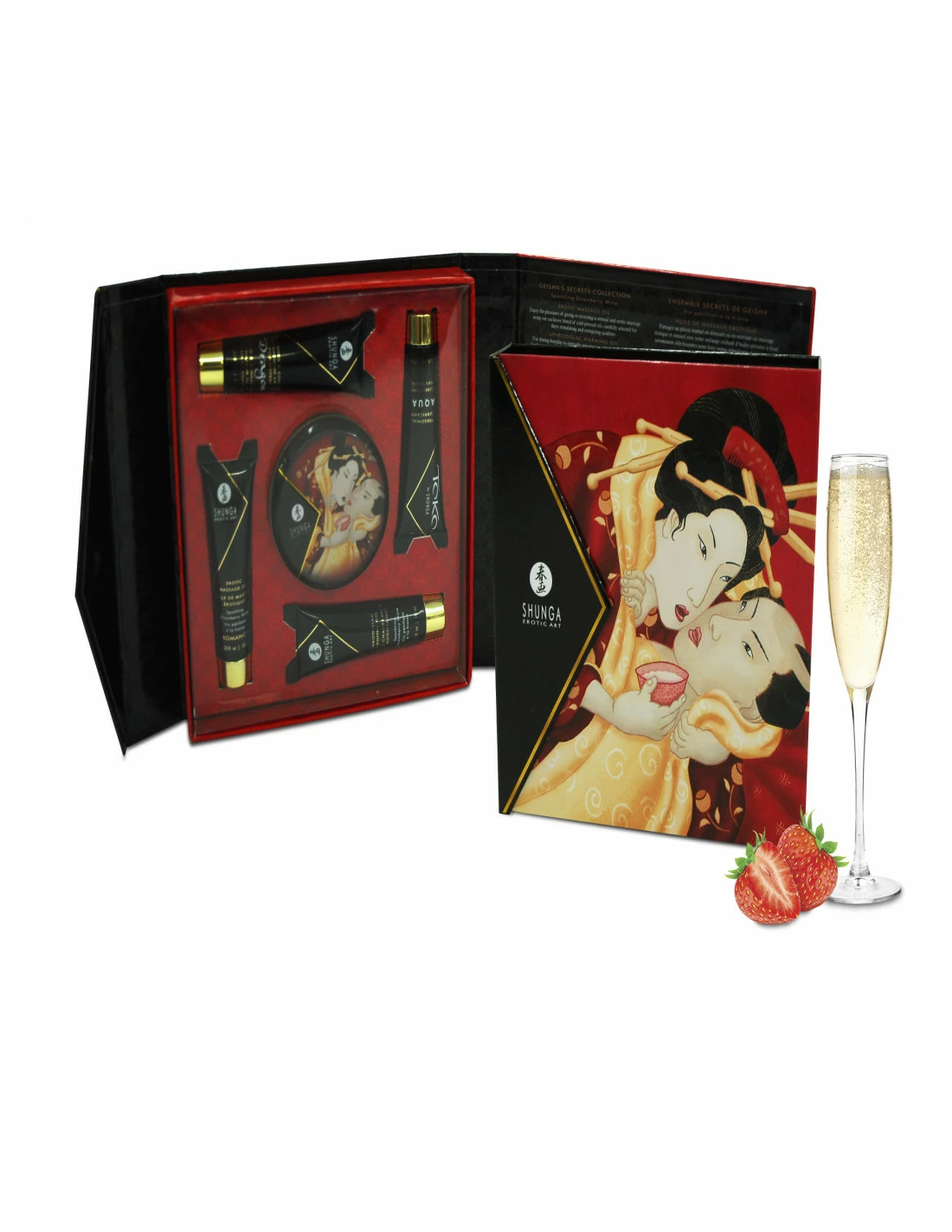 Le Coffret de Massage Secrets de Shunga au parfum vin pĂ©tillant Ă la fraise est vendu dans une belle boĂ®te au style japonais au style japonais des plus plaisant.Â