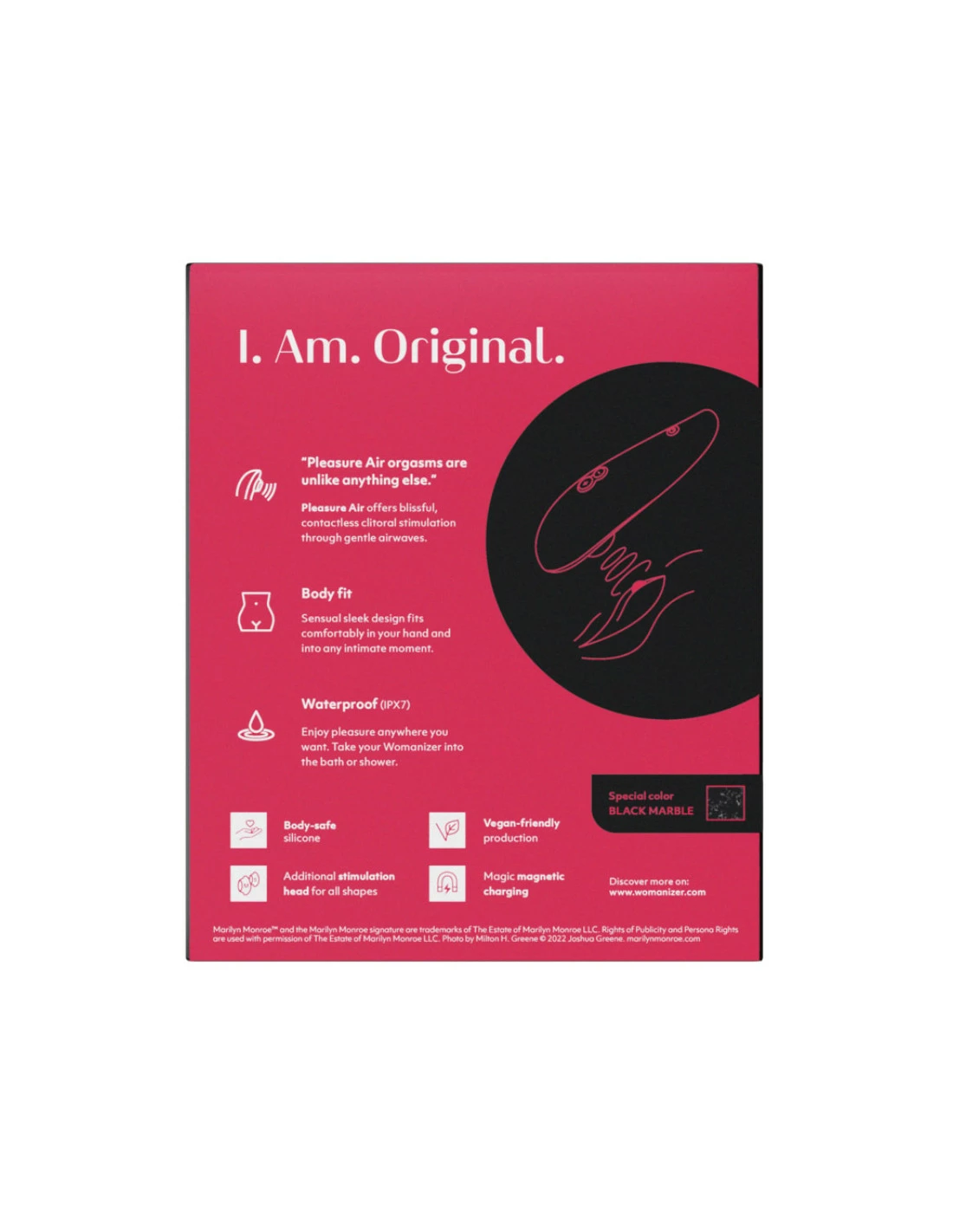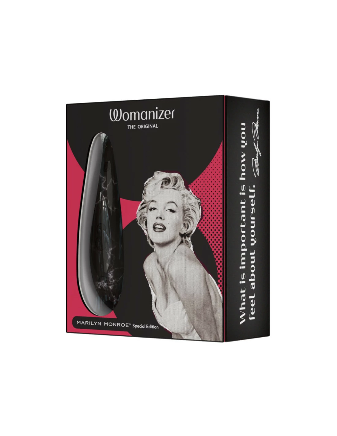 - L’originalité : comme Marilyn, vous aimez être unique, ne pas renter dans une case. C’est pourquoi ce Womanizer Edition Spéciale se pare de 4 robes éclatantes et fastueuses : vert menthe, rouge vif, marbré noir ou marbré blanc.